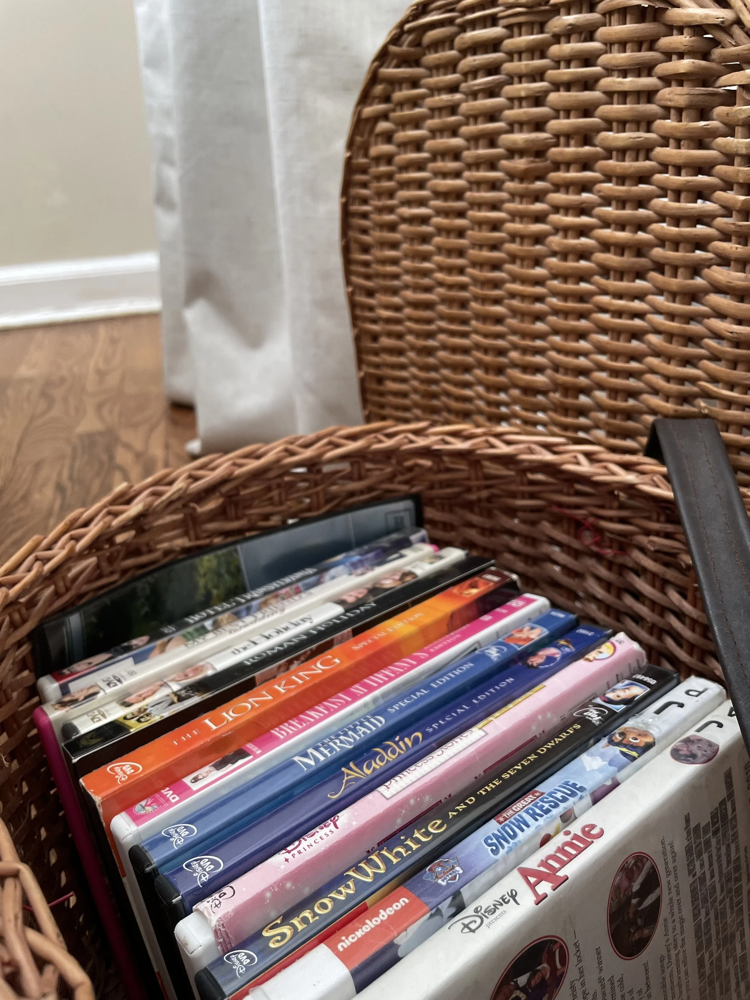 If you have your own DVDs at home, you can also make that an experience. I placed some of my DVDs in a cute basket I thrifted a while ago. It feels exciting, cozy, and unexpected. The possibilities are endless with wicker baskets. I plan to rotate the DVDs to make it feel like a new, exciting experience. And instead of just having them sit on a shelf, I feel like we’re unlocking treasure.